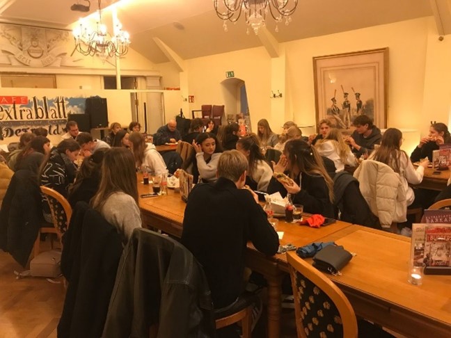 Am Mittwoch folgte nach einem ausgiebigem Frühstück wieder die Arbeit. Thema des heutigen Tages waren geschichtliche Ereignisse aus verschiedenen Perspektiven aus gesehen, die mit den Ländern Polen und Deutschland verknüpft waren. Schülergewählte Themen gab es vom Ende des zweiten Weltkrieges bis hin zum Warschauer Kniefall, die dann von den einzelnen Gruppen präsentiert wurden, immer unter der Prämisse, dass es für viele geschichtliche Ereignisse auch immer verschiedene Perspektiven und Sichtweisen gibt. Zum Mittagessen blieben wir noch in der Villa Welschen, danach aber fuhren wir mit dem Reisebus nach Detmold. Dort besuchten wir ein Museum zum Thema Russlanddeutsche und deren Geschichte. Nach zwei Stunden intensiver Arbeit und Information wurden wir dann in die Innenstadt nach Detmold gebracht, dort gab es Zeit, um in Kleingruppen die Stadt zu erkunden, bevor wir uns um 18.15 Uhr im Restaurant „Extrablatt“ zum Abendessen trafen. Ob Burger, Pizza, Schnitzel oder Wraps, alle waren in hohem Maße zufrieden, vor allem auch, weil das Essen uns von der Akademie ausgegeben wurde (#DankeanKarstenundCaro). Satt und zufrieden ging es dann mit dem Bus zurück nach Oerlinghausen. Ab 21.00 Uhr trafen sich dann aber alle wieder zum gemeinsamen Spielen, quatschen, etc. Die Grenzen zwischen den Ländern waren schon lange aufgebrochen, rundherum konnte man in glückliche und zufriedene Gesichter blicken.